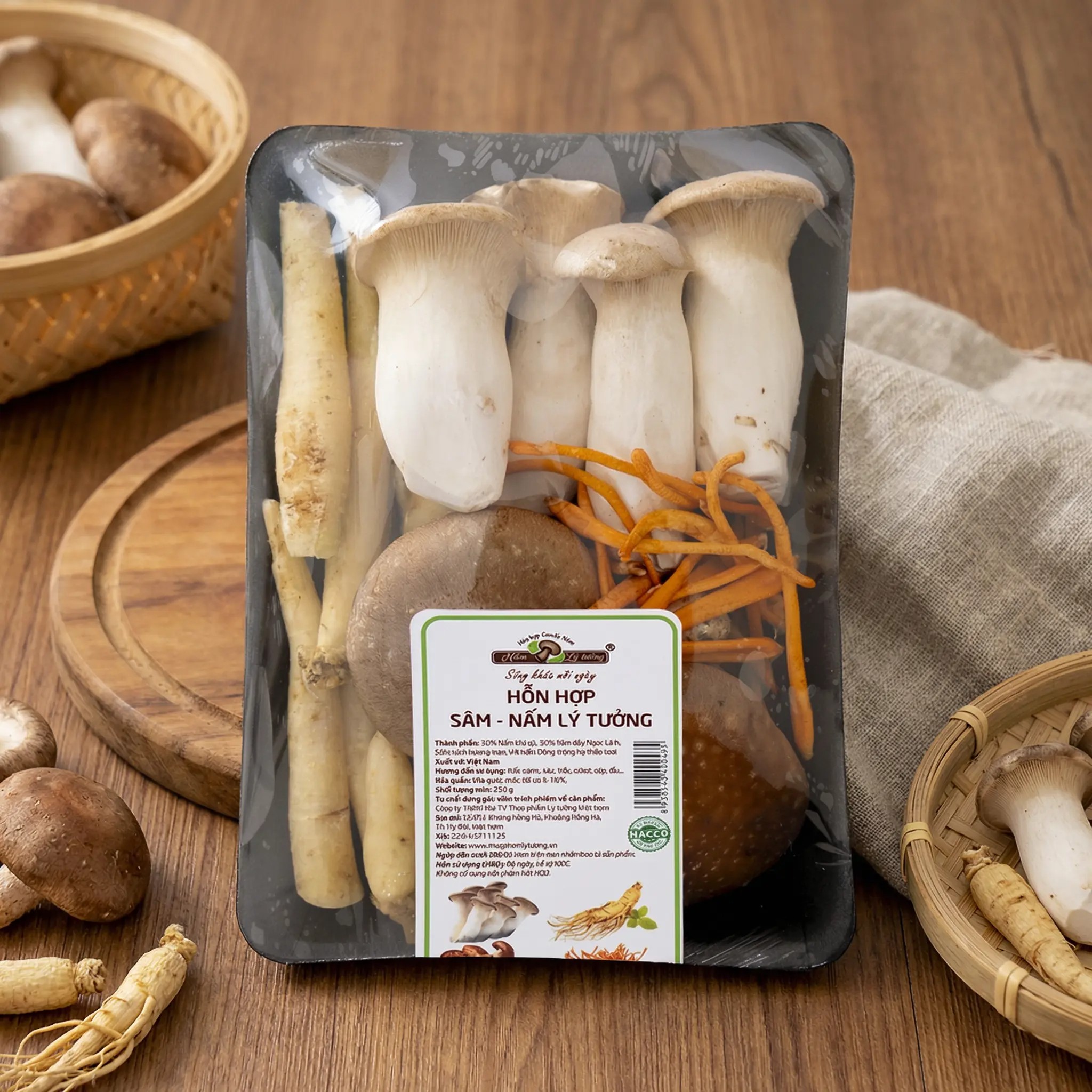 Hỗn hợp sâm nấm là sự kết hợp cân đối giữa nấm tươi và sâm dây Ngọc Linh, được tuyển chọn kỹ lưỡng nhằm mang đến nguồn nguyên liệu tươi sạch, giàu dinh dưỡng và dễ chế biến cho bữa ăn hằng ngày.